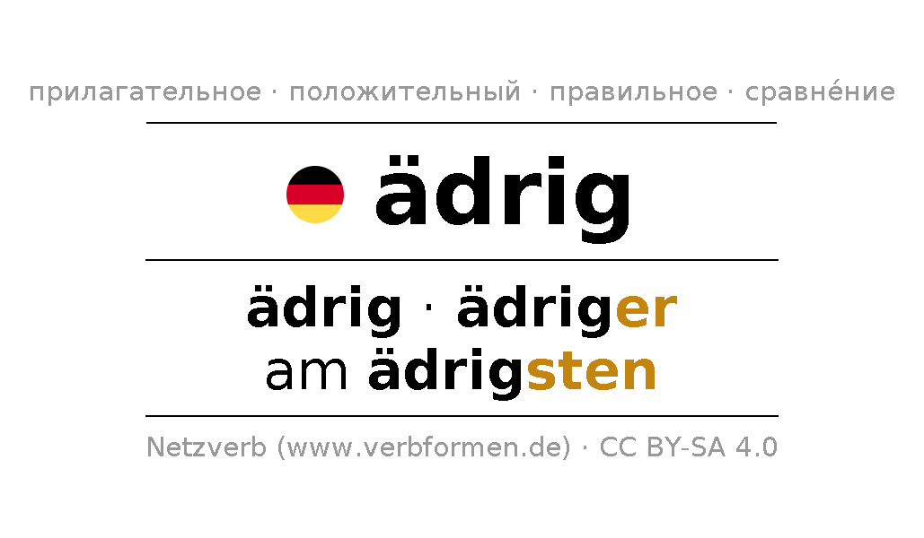 Прилагательное склоняется ädrig (переплетённый) и в степенях сравнения ädrig,ädriger,am ädrigsten . Формы сравнительной и превосходной степеней прилагательного имеют следующие суффиксы er/sten. Прилагательное ädrig может употребляться как в качестве определения перед существительным (с артиклем и без него, в формах сильного, слабого и смешанного склонений), так и в качестве именной части сказуемого в сочетании с глаголом.Можно не только отразить и сравнить ädrig, но и все немецкие прилагательные. Kомментарии ☆