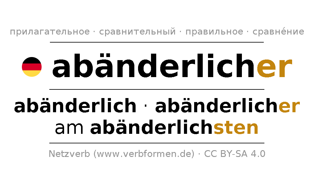 Прилагательное склоняется abänderlicher (изменяемый, подлежащий изменению) и в степенях сравнения abänderlich,abänderlicher,am abänderlichsten . Формы сравнительной и превосходной степеней прилагательного имеют следующие суффиксы er/sten. Прилагательное abänderlicher может употребляться как в качестве определения перед существительным (с артиклем и без него, в формах сильного, слабого и смешанного склонений), так и в качестве именной части сказуемого в сочетании с глаголом.Можно не только отразить и сравнить abänderlicher, но и все немецкие прилагательные. Kомментарии ☆