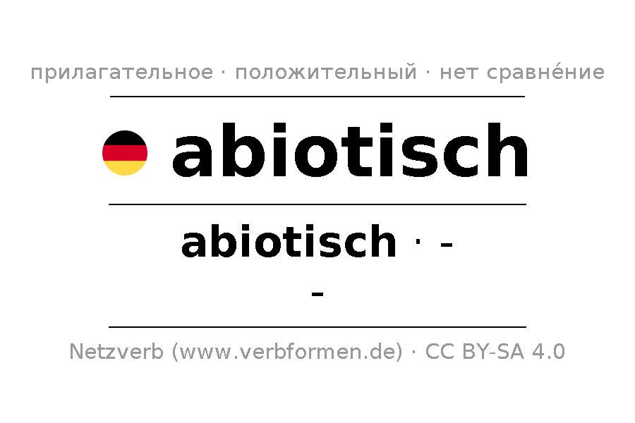 Прилагательное склоняется abiotisch (абиотический) и в степенях сравнения abiotisch,-,- . Формы сравнительной и превосходной степеней прилагательного имеют следующие суффиксы -/-. Прилагательное abiotisch может употребляться как в качестве определения перед существительным (с артиклем и без него, в формах сильного, слабого и смешанного склонений), так и в качестве именной части сказуемого в сочетании с глаголом.Можно не только отразить и сравнить abiotisch, но и все немецкие прилагательные. Kомментарии ☆
