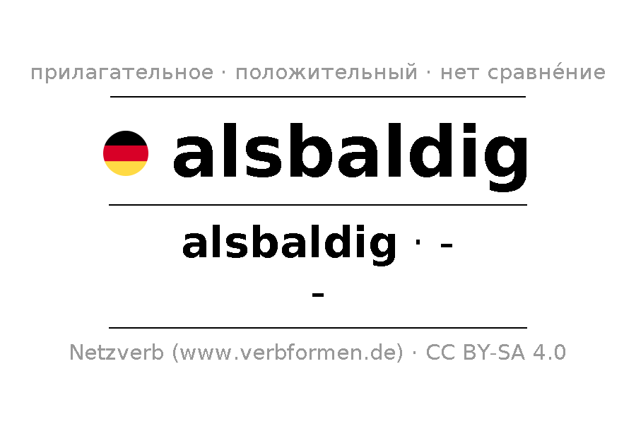 Прилагательное alsbaldig (в ближайшем будущем, скоро) склоняется в положительной степени сравнения alsbaldig. Прилагательное не имеет сравнительной и превосходной степеней сравнения. Прилагательное alsbaldig может употребляться как в качестве определения перед существительным (с артиклем и без него, в формах сильного, слабого и смешанного склонений), так и в качестве именной части сказуемого в сочетании с глаголом.Можно не только отразить и сравнить alsbaldig, но и все немецкие прилагательные. Kомментарии ☆