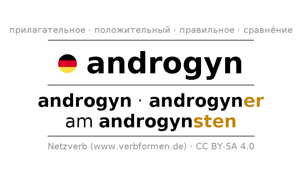 Прилагательное склоняется androgyn (андрогинный, андрогин) и в степенях сравнения androgyn,androgyner,am androgynsten . Формы сравнительной и превосходной степеней прилагательного имеют следующие суффиксы er/sten. Прилагательное androgyn может употребляться как в качестве определения перед существительным (с артиклем и без него, в формах сильного, слабого и смешанного склонений), так и в качестве именной части сказуемого в сочетании с глаголом.Можно не только отразить и сравнить androgyn, но и все немецкие прилагательные. Kомментарии ☆