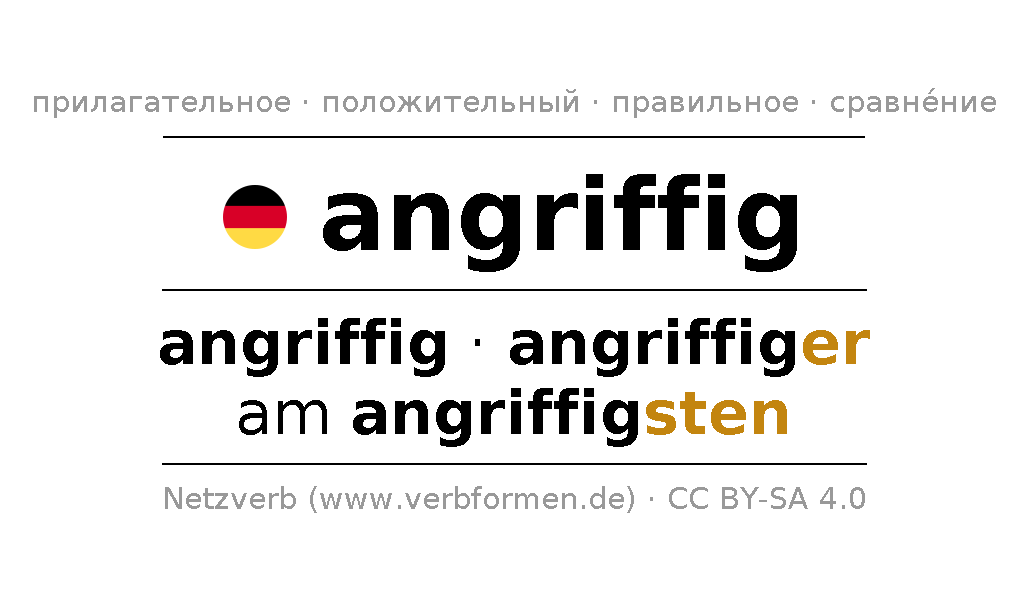 Прилагательное склоняется angriffig (агрессивный, нападающий) и в степенях сравнения angriffig,angriffiger,am angriffigsten . Формы сравнительной и превосходной степеней прилагательного имеют следующие суффиксы er/sten. Прилагательное angriffig может употребляться как в качестве определения перед существительным (с артиклем и без него, в формах сильного, слабого и смешанного склонений), так и в качестве именной части сказуемого в сочетании с глаголом.Можно не только отразить и сравнить angriffig, но и все немецкие прилагательные. Kомментарии ☆