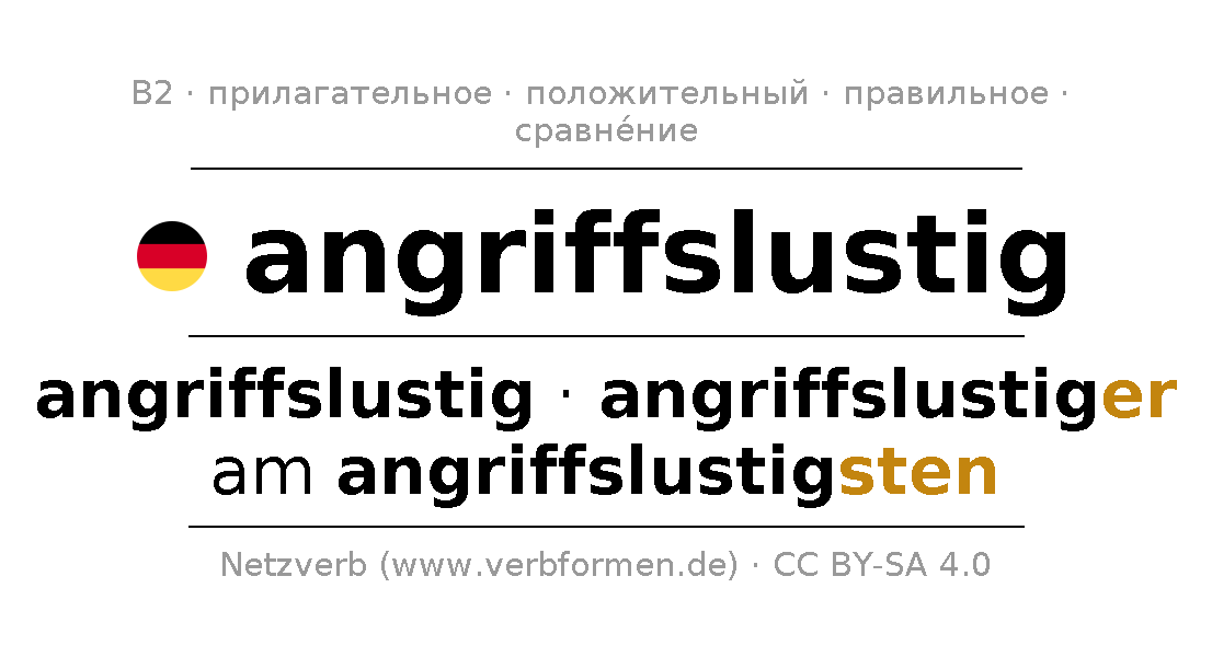 Прилагательное склоняется angriffslustig (нападающий, агрессивный) и в степенях сравнения angriffslustig,angriffslustiger,am angriffslustigsten . Формы сравнительной и превосходной степеней прилагательного имеют следующие суффиксы er/sten. Прилагательное angriffslustig может употребляться как в качестве определения перед существительным (с артиклем и без него, в формах сильного, слабого и смешанного склонений), так и в качестве именной части сказуемого в сочетании с глаголом.Можно не только отразить и сравнить angriffslustig, но и все немецкие прилагательные. Kомментарии ☆