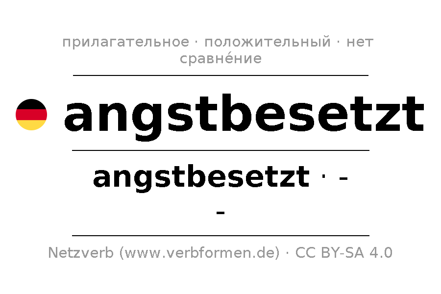 Прилагательное angstbesetzt (наполненный страхом, обременённый страхом) склоняется в положительной степени сравнения angstbesetzt. Прилагательное не имеет сравнительной и превосходной степеней сравнения. Прилагательное angstbesetzt может употребляться как в качестве определения перед существительным (с артиклем и без него, в формах сильного, слабого и смешанного склонений), так и в качестве именной части сказуемого в сочетании с глаголом.Можно не только отразить и сравнить angstbesetzt, но и все немецкие прилагательные. Kомментарии ☆