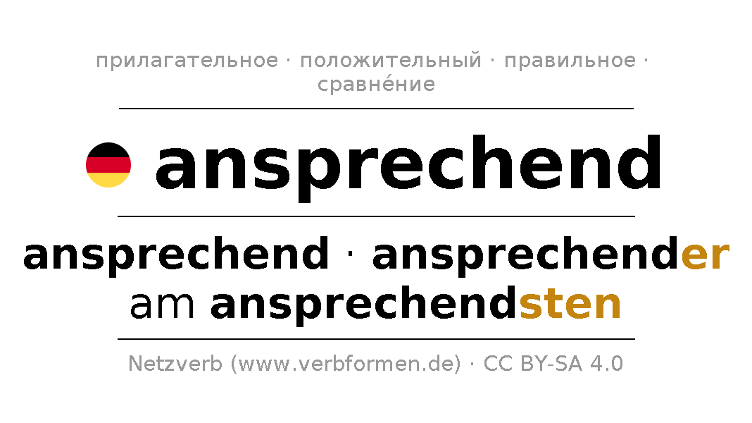 Склонение и степени сравнения ansprechend онлайн в виде таблиц, содержащих все формы сильного, слабого и смешанного склонений. Для наглядности они сведены в одну общую таблицу, в которой представлены формы единственного (Singular) и множественного (Plural) числа всех четырёх падежей: именительного (номинатив или 1-й падеж - кто? что?), родительного (генитив или 2-й падеж - кого? чего? чей?), дательного (датив или 3-й падеж - кому? чему?) и винительного (аккузатив или 4-й падеж - кого? что?). Более подробную информацию Вы найдёте на ... викисловаря ... и на ... в Дудене.