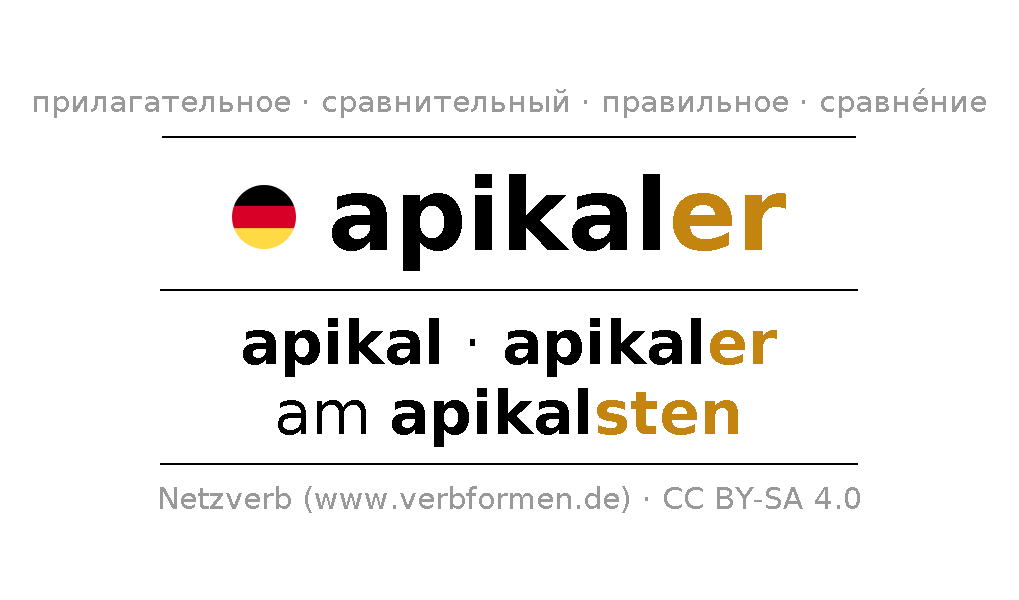 Прилагательное склоняется apikaler (апикальный) и в степенях сравнения apikal,apikaler,am apikalsten . Формы сравнительной и превосходной степеней прилагательного имеют следующие суффиксы er/sten. Прилагательное apikaler может употребляться как в качестве определения перед существительным (с артиклем и без него, в формах сильного, слабого и смешанного склонений), так и в качестве именной части сказуемого в сочетании с глаголом.Можно не только отразить и сравнить apikaler, но и все немецкие прилагательные. Kомментарии ☆