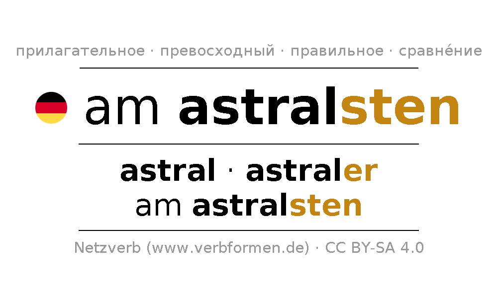 Прилагательное склоняется am astralsten (астральный) и в степенях сравнения astral,astraler,am astralsten . Формы сравнительной и превосходной степеней прилагательного имеют следующие суффиксы er/sten. Прилагательное am astralsten может употребляться как в качестве определения перед существительным (с артиклем и без него, в формах сильного, слабого и смешанного склонений), так и в качестве именной части сказуемого в сочетании с глаголом.Можно не только отразить и сравнить am astralsten, но и все немецкие прилагательные. Kомментарии ☆