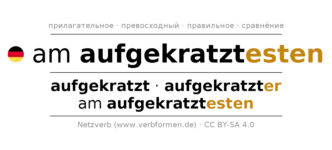 - Средний род: das aufgekratzteste, des aufgekratztesten, dem aufgekratztesten, das aufgekratzteste