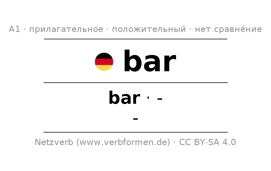 Прилагательное bar (голый, деньги) склоняется в положительной степени сравнения bar. Прилагательное не имеет сравнительной и превосходной степеней сравнения. Прилагательное bar может употребляться как в качестве определения перед существительным (с артиклем и без него, в формах сильного, слабого и смешанного склонений), так и в качестве именной части сказуемого в сочетании с глаголом.Можно не только отразить и сравнить bar, но и все немецкие прилагательные. Kомментарии ☆