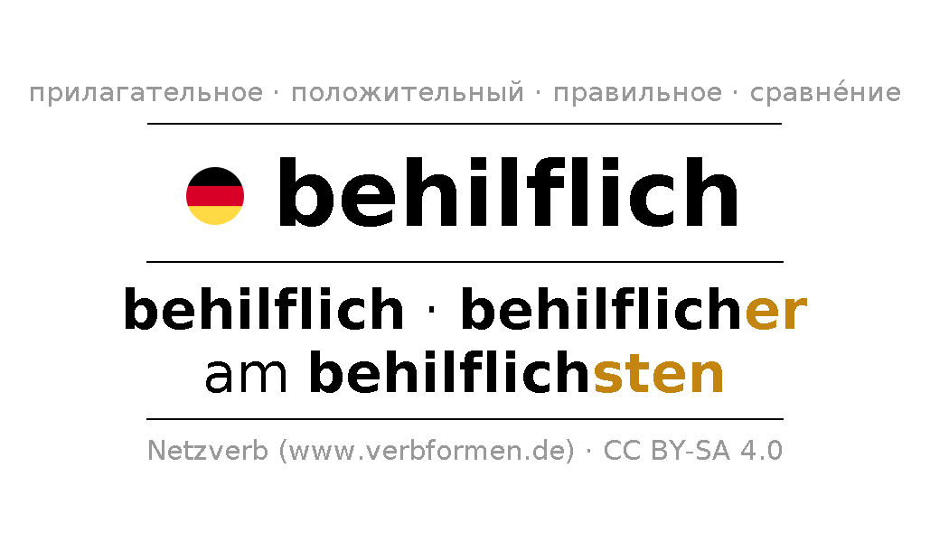 Прилагательное склоняется behilflich (помогающий, помощник) и в степенях сравнения behilflich,behilflicher,am behilflichsten . Формы сравнительной и превосходной степеней прилагательного имеют следующие суффиксы er/sten. Прилагательное behilflich может употребляться как в качестве определения перед существительным (с артиклем и без него, в формах сильного, слабого и смешанного склонений), так и в качестве именной части сказуемого в сочетании с глаголом.Можно не только отразить и сравнить behilflich, но и все немецкие прилагательные. Kомментарии ☆