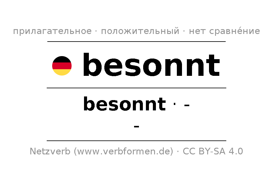 Склонение и степени сравнения besonnt онлайн в виде таблиц, содержащих все формы сильного, слабого и смешанного склонений. Для наглядности они сведены в одну общую таблицу, в которой представлены формы единственного (Singular) и множественного (Plural) числа всех четырёх падежей: именительного (номинатив или 1-й падеж - кто? что?), родительного (генитив или 2-й падеж - кого? чего? чей?), дательного (датив или 3-й падеж - кому? чему?) и винительного (аккузатив или 4-й падеж - кого? что?). Более подробную информацию Вы найдёте на ... викисловаря ... и на ... в Дудене.