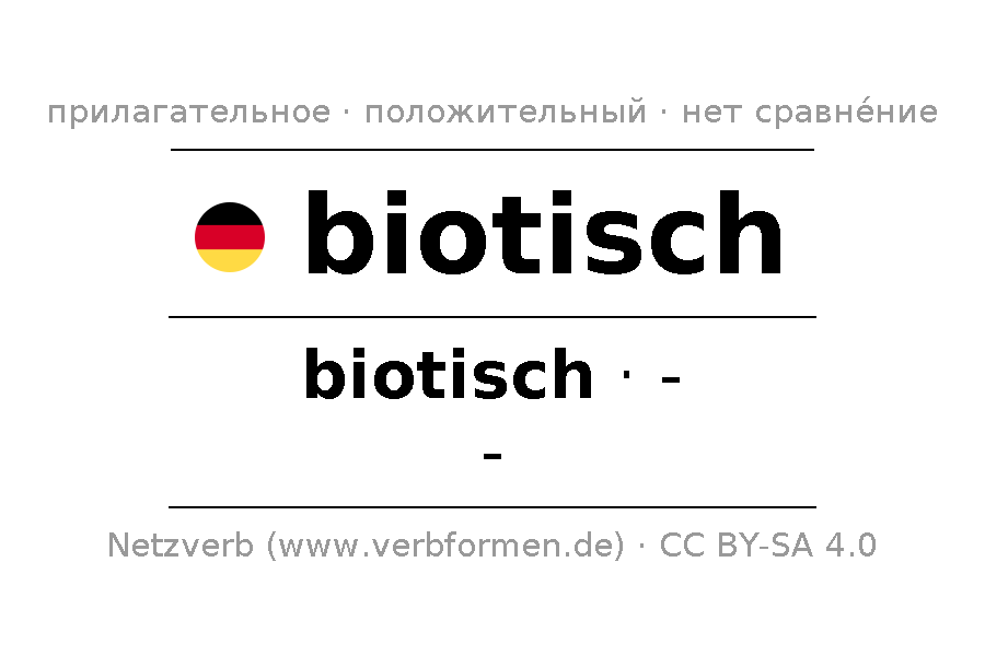 Прилагательное biotisch (биотический) склоняется в положительной степени сравнения biotisch. Прилагательное не имеет сравнительной и превосходной степеней сравнения. Прилагательное biotisch может употребляться как в качестве определения перед существительным (с артиклем и без него, в формах сильного, слабого и смешанного склонений), так и в качестве именной части сказуемого в сочетании с глаголом.Можно не только отразить и сравнить biotisch, но и все немецкие прилагательные. Kомментарии ☆