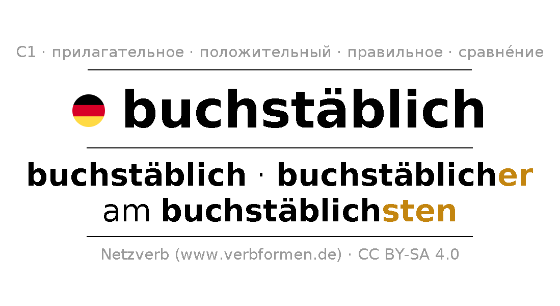 Прилагательное склоняется buchstäblich (буквально) и в степенях сравнения buchstäblich,buchstäblicher,am buchstäblichsten . Формы сравнительной и превосходной степеней прилагательного имеют следующие суффиксы er/sten. Прилагательное buchstäblich может употребляться как в качестве определения перед существительным (с артиклем и без него, в формах сильного, слабого и смешанного склонений), так и в качестве именной части сказуемого в сочетании с глаголом.Можно не только отразить и сравнить buchstäblich, но и все немецкие прилагательные. Kомментарии ☆