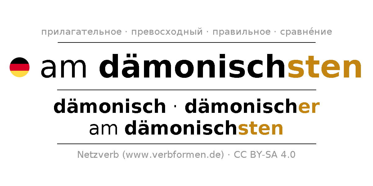 - Множественное число: die dämonischsten, der dämonischsten, den dämonischsten, die dämonischsten