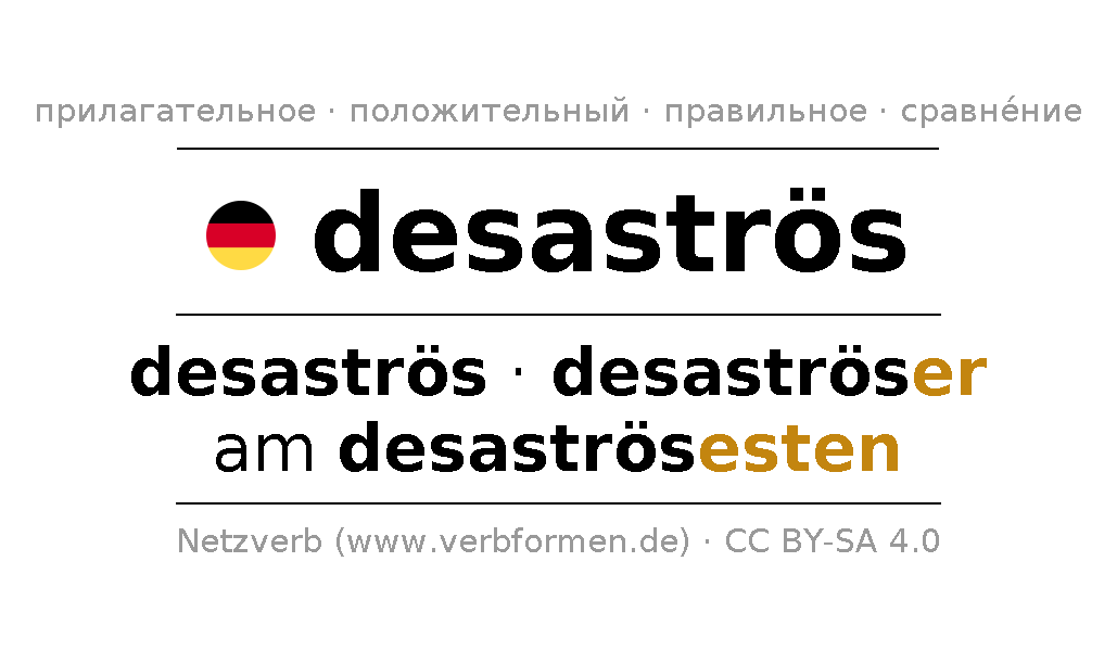 Прилагательное склоняется desaströs (катастрофический, ужасный) и в степенях сравнения desaströs,desaströser,am desaströsesten . Формы сравнительной и превосходной степеней прилагательного имеют следующие суффиксы er/esten. Прилагательное desaströs может употребляться как в качестве определения перед существительным (с артиклем и без него, в формах сильного, слабого и смешанного склонений), так и в качестве именной части сказуемого в сочетании с глаголом.Можно не только отразить и сравнить desaströs, но и все немецкие прилагательные. Kомментарии ☆