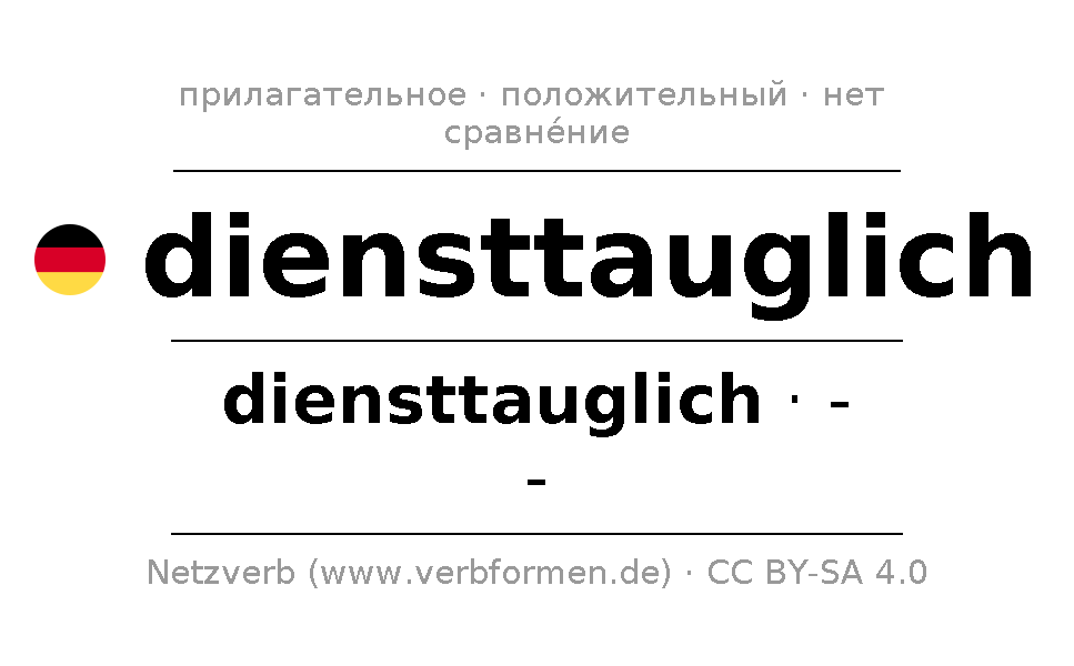 Склонение и степени сравнения diensttauglich онлайн в виде таблиц, содержащих все формы сильного, слабого и смешанного склонений. Для наглядности они сведены в одну общую таблицу, в которой представлены формы единственного (Singular) и множественного (Plural) числа всех четырёх падежей: именительного (номинатив или 1-й падеж - кто? что?), родительного (генитив или 2-й падеж - кого? чего? чей?), дательного (датив или 3-й падеж - кому? чему?) и винительного (аккузатив или 4-й падеж - кого? что?). Более подробную информацию Вы найдёте на ... викисловаря ... и на ... в Дудене.