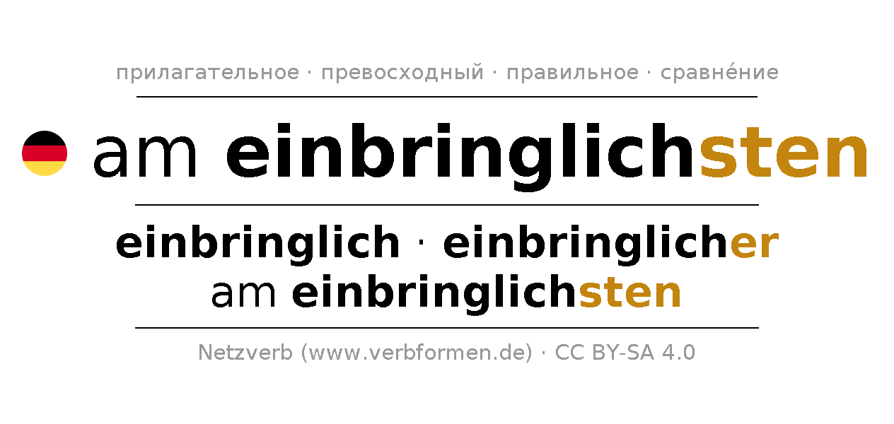 Прилагательное склоняется am einbringlichsten (приносящий много, приносящий прибыль) и в степенях сравнения einbringlich,einbringlicher,am einbringlichsten . Формы сравнительной и превосходной степеней прилагательного имеют следующие суффиксы er/sten. Прилагательное am einbringlichsten может употребляться как в качестве определения перед существительным (с артиклем и без него, в формах сильного, слабого и смешанного склонений), так и в качестве именной части сказуемого в сочетании с глаголом.Можно не только отразить и сравнить am einbringlichsten, но и все немецкие прилагательные. Kомментарии ☆