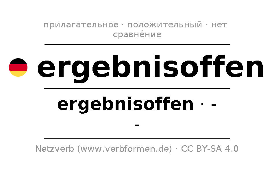 Прилагательное ergebnisoffen (без ожиданий, непредвзятый) склоняется в положительной степени сравнения ergebnisoffen. Прилагательное не имеет сравнительной и превосходной степеней сравнения. Прилагательное ergebnisoffen может употребляться как в качестве определения перед существительным (с артиклем и без него, в формах сильного, слабого и смешанного склонений), так и в качестве именной части сказуемого в сочетании с глаголом.Можно не только отразить и сравнить ergebnisoffen, но и все немецкие прилагательные. Kомментарии ☆