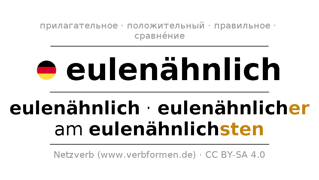 Прилагательное склоняется eulenähnlich (совиный) и в степенях сравнения eulenähnlich,eulenähnlicher,am eulenähnlichsten . Формы сравнительной и превосходной степеней прилагательного имеют следующие суффиксы er/sten. Прилагательное eulenähnlich может употребляться как в качестве определения перед существительным (с артиклем и без него, в формах сильного, слабого и смешанного склонений), так и в качестве именной части сказуемого в сочетании с глаголом.Можно не только отразить и сравнить eulenähnlich, но и все немецкие прилагательные. Kомментарии ☆