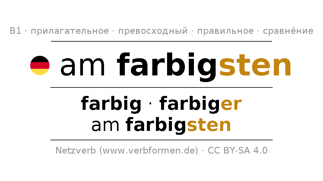 Прилагательное склоняется am farbigsten (цветной, яркий) и в степенях сравнения farbig,farbiger,am farbigsten . Формы сравнительной и превосходной степеней прилагательного имеют следующие суффиксы er/sten. Прилагательное am farbigsten может употребляться как в качестве определения перед существительным (с артиклем и без него, в формах сильного, слабого и смешанного склонений), так и в качестве именной части сказуемого в сочетании с глаголом.Можно не только отразить и сравнить am farbigsten, но и все немецкие прилагательные. Kомментарии ☆