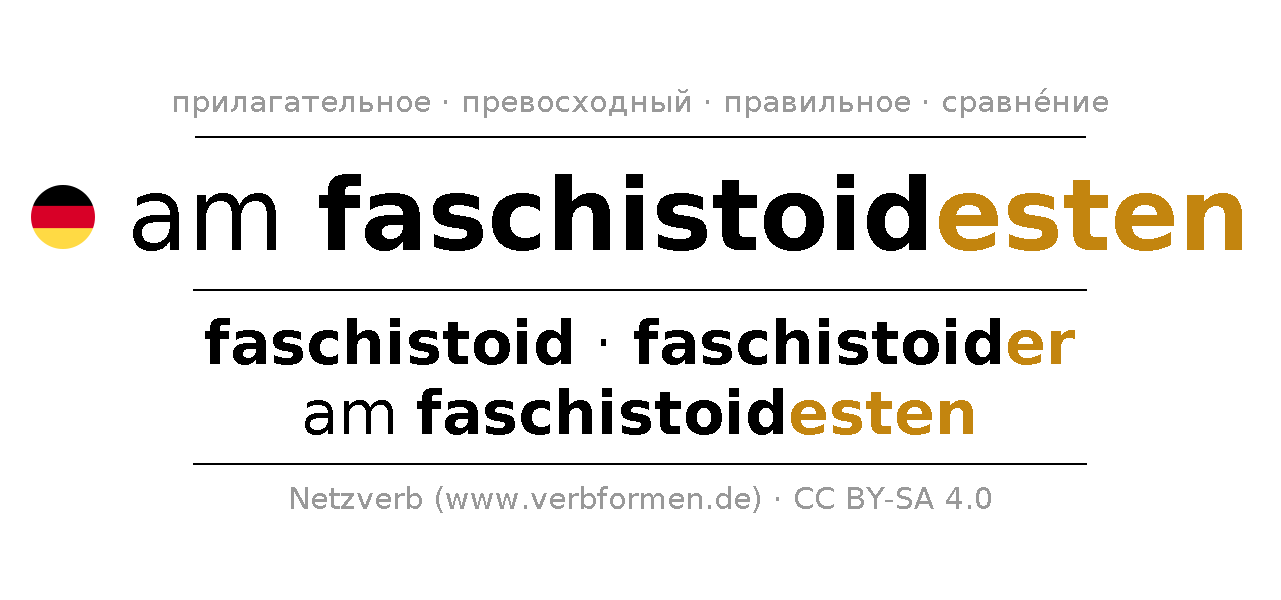 Прилагательное склоняется am faschistoidesten (похожий на фашизм, фашистский) и в степенях сравнения faschistoid,faschistoider,am faschistoidesten . Формы сравнительной и превосходной степеней прилагательного имеют следующие суффиксы er/esten. Прилагательное am faschistoidesten может употребляться как в качестве определения перед существительным (с артиклем и без него, в формах сильного, слабого и смешанного склонений), так и в качестве именной части сказуемого в сочетании с глаголом.Можно не только отразить и сравнить am faschistoidesten, но и все немецкие прилагательные. Kомментарии ☆