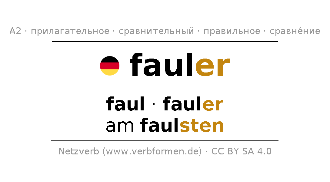 Прилагательное склоняется fauler (ленивый, подозрительный) и в степенях сравнения faul,fauler,am faulsten . Формы сравнительной и превосходной степеней прилагательного имеют следующие суффиксы er/sten. Прилагательное fauler может употребляться как в качестве определения перед существительным (с артиклем и без него, в формах сильного, слабого и смешанного склонений), так и в качестве именной части сказуемого в сочетании с глаголом.Можно не только отразить и сравнить fauler, но и все немецкие прилагательные. Kомментарии ☆