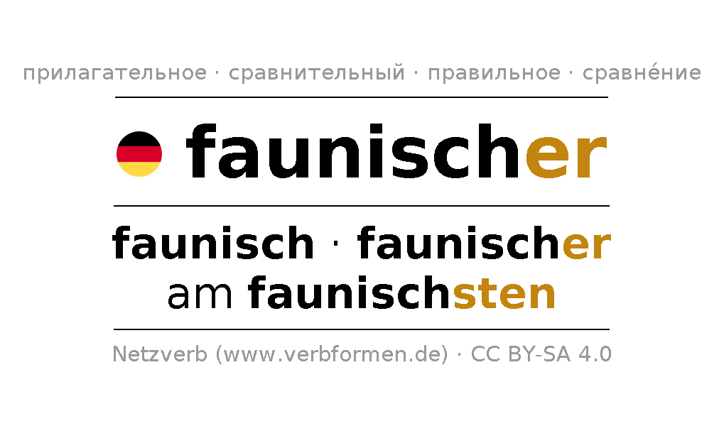 Прилагательное склоняется faunischer (фавноподобный) и в степенях сравнения faunisch,faunischer,am faunischsten . Формы сравнительной и превосходной степеней прилагательного имеют следующие суффиксы er/sten. Прилагательное faunischer может употребляться как в качестве определения перед существительным (с артиклем и без него, в формах сильного, слабого и смешанного склонений), так и в качестве именной части сказуемого в сочетании с глаголом.Можно не только отразить и сравнить faunischer, но и все немецкие прилагательные. Kомментарии ☆