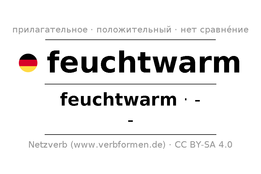 Склонение и степени сравнения feuchtwarm онлайн в виде таблиц, содержащих все формы сильного, слабого и смешанного склонений. Для наглядности они сведены в одну общую таблицу, в которой представлены формы единственного (Singular) и множественного (Plural) числа всех четырёх падежей: именительного (номинатив или 1-й падеж - кто? что?), родительного (генитив или 2-й падеж - кого? чего? чей?), дательного (датив или 3-й падеж - кому? чему?) и винительного (аккузатив или 4-й падеж - кого? что?). Более подробную информацию Вы найдёте на ... викисловаря ... и на ... в Дудене.