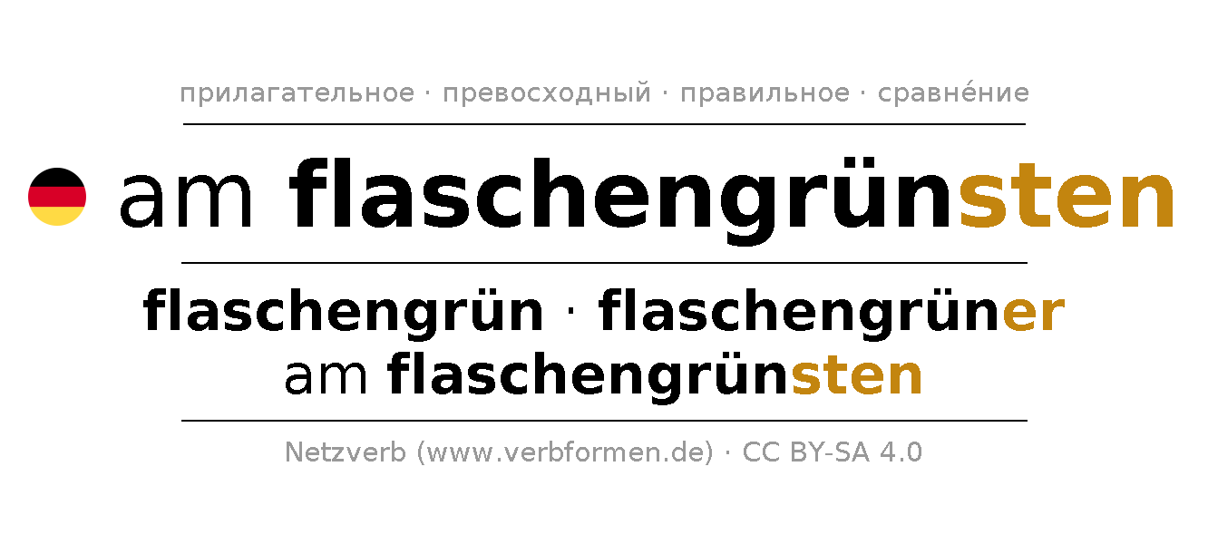 Прилагательное склоняется am flaschengrünsten (зеленый как стекло, темно-зеленый) и в степенях сравнения flaschengrün,flaschengrüner,am flaschengrünsten . Формы сравнительной и превосходной степеней прилагательного имеют следующие суффиксы er/sten. Прилагательное am flaschengrünsten может употребляться как в качестве определения перед существительным (с артиклем и без него, в формах сильного, слабого и смешанного склонений), так и в качестве именной части сказуемого в сочетании с глаголом.Можно не только отразить и сравнить am flaschengrünsten, но и все немецкие прилагательные. Kомментарии ☆