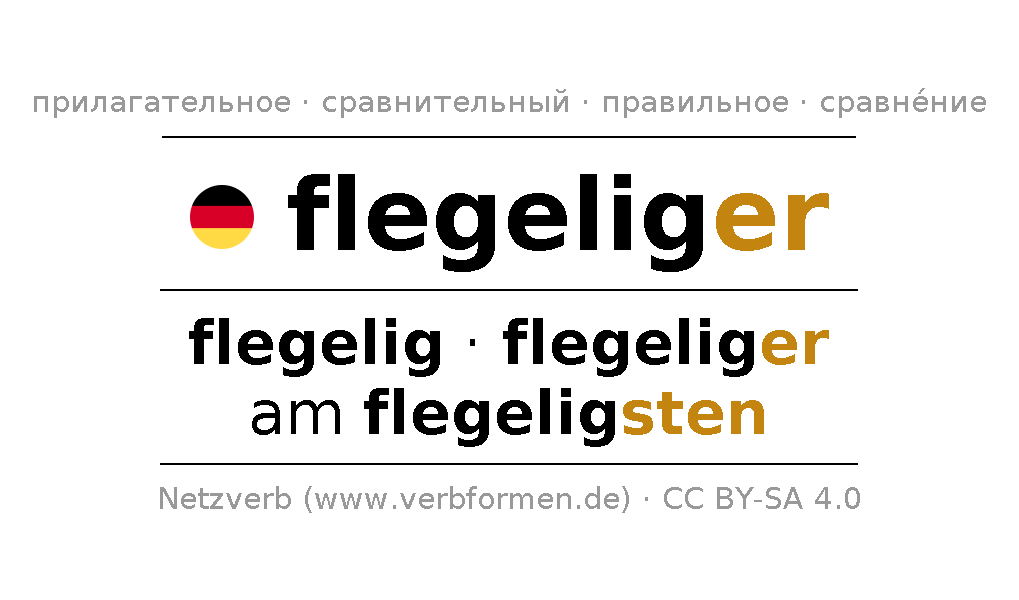 Склонение и степени сравнения flegeliger онлайн в виде таблиц, содержащих все формы сильного, слабого и смешанного склонений. Для наглядности они сведены в одну общую таблицу, в которой представлены формы единственного (Singular) и множественного (Plural) числа всех четырёх падежей: именительного (номинатив или 1-й падеж - кто? что?), родительного (генитив или 2-й падеж - кого? чего? чей?), дательного (датив или 3-й падеж - кому? чему?) и винительного (аккузатив или 4-й падеж - кого? что?). Более подробную информацию Вы найдёте на ... викисловаря ... и на ... в Дудене.