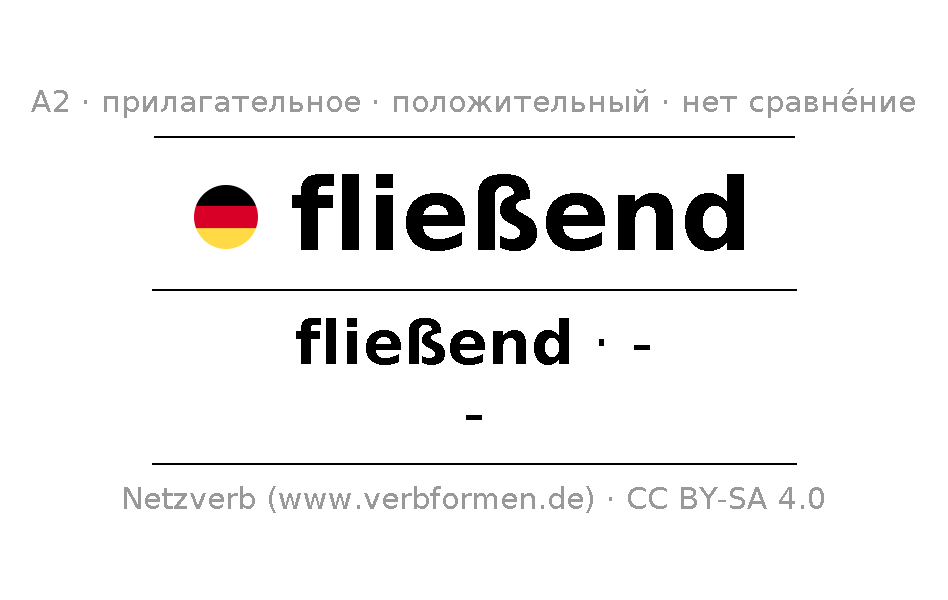 Прилагательное fließend (бесперебойный, плавный) склоняется в положительной степени сравнения fließend. Прилагательное не имеет сравнительной и превосходной степеней сравнения. Прилагательное fließend может употребляться как в качестве определения перед существительным (с артиклем и без него, в формах сильного, слабого и смешанного склонений), так и в качестве именной части сказуемого в сочетании с глаголом.Можно не только отразить и сравнить fließend, но и все немецкие прилагательные. Kомментарии ☆