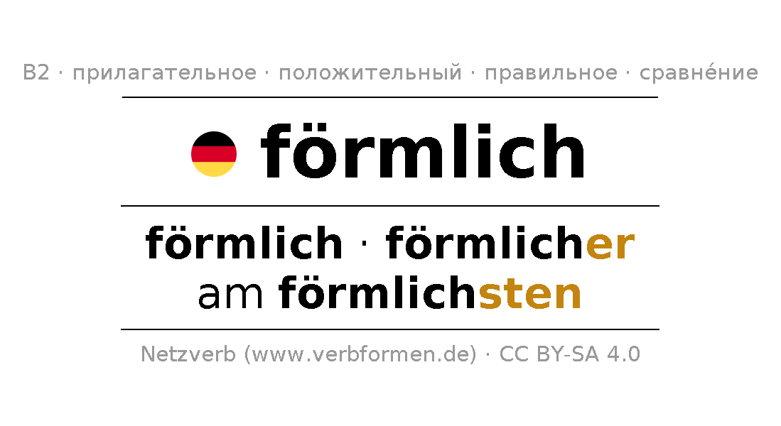 Прилагательное склоняется förmlich (формальный, официальный) и в степенях сравнения förmlich,förmlicher,am förmlichsten . Формы сравнительной и превосходной степеней прилагательного имеют следующие суффиксы er/sten. Прилагательное förmlich может употребляться как в качестве определения перед существительным (с артиклем и без него, в формах сильного, слабого и смешанного склонений), так и в качестве именной части сказуемого в сочетании с глаголом.Можно не только отразить и сравнить förmlich, но и все немецкие прилагательные. Kомментарии ☆