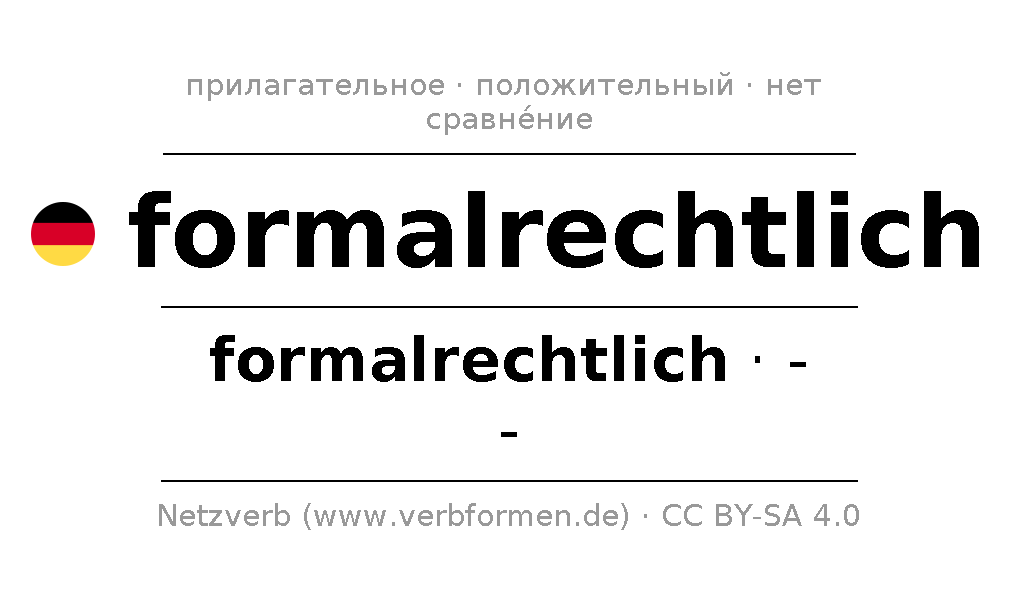 Склонение и степени сравнения formalrechtlich онлайн в виде таблиц, содержащих все формы сильного, слабого и смешанного склонений. Для наглядности они сведены в одну общую таблицу, в которой представлены формы единственного (Singular) и множественного (Plural) числа всех четырёх падежей: именительного (номинатив или 1-й падеж - кто? что?), родительного (генитив или 2-й падеж - кого? чего? чей?), дательного (датив или 3-й падеж - кому? чему?) и винительного (аккузатив или 4-й падеж - кого? что?). Более подробную информацию Вы найдёте на ... викисловаря ... и на ... в Дудене.