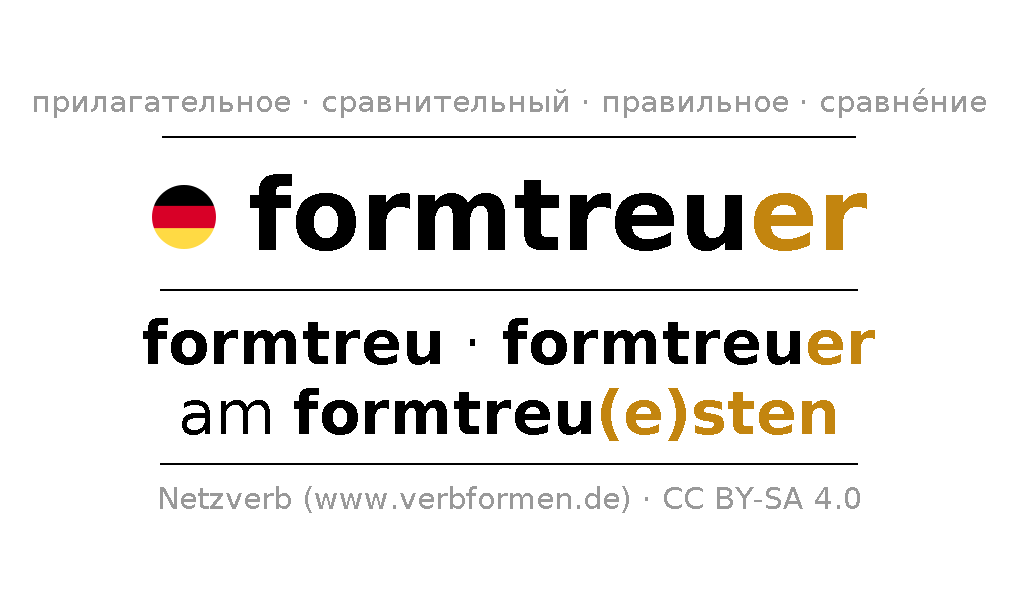 Прилагательное склоняется formtreuer (соответствующий форме) и в степенях сравнения formtreu,formtreuer,am formtreuesten . Формы сравнительной и превосходной степеней прилагательного имеют следующие суффиксы er/esten. Прилагательное formtreuer может употребляться как в качестве определения перед существительным (с артиклем и без него, в формах сильного, слабого и смешанного склонений), так и в качестве именной части сказуемого в сочетании с глаголом.Можно не только отразить и сравнить formtreuer, но и все немецкие прилагательные. Kомментарии ☆