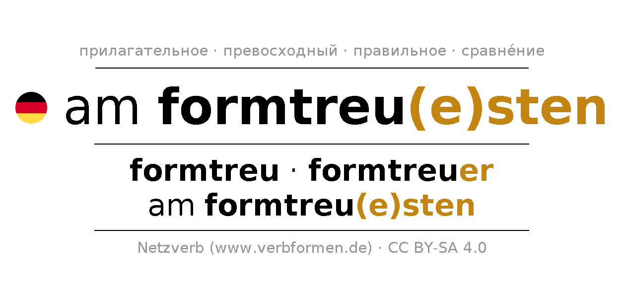 Прилагательное склоняется am formtreuesten (соответствующий форме) и в степенях сравнения formtreu,formtreuer,am formtreuesten . Формы сравнительной и превосходной степеней прилагательного имеют следующие суффиксы er/esten. Прилагательное am formtreuesten может употребляться как в качестве определения перед существительным (с артиклем и без него, в формах сильного, слабого и смешанного склонений), так и в качестве именной части сказуемого в сочетании с глаголом.Можно не только отразить и сравнить am formtreuesten, но и все немецкие прилагательные. Kомментарии ☆