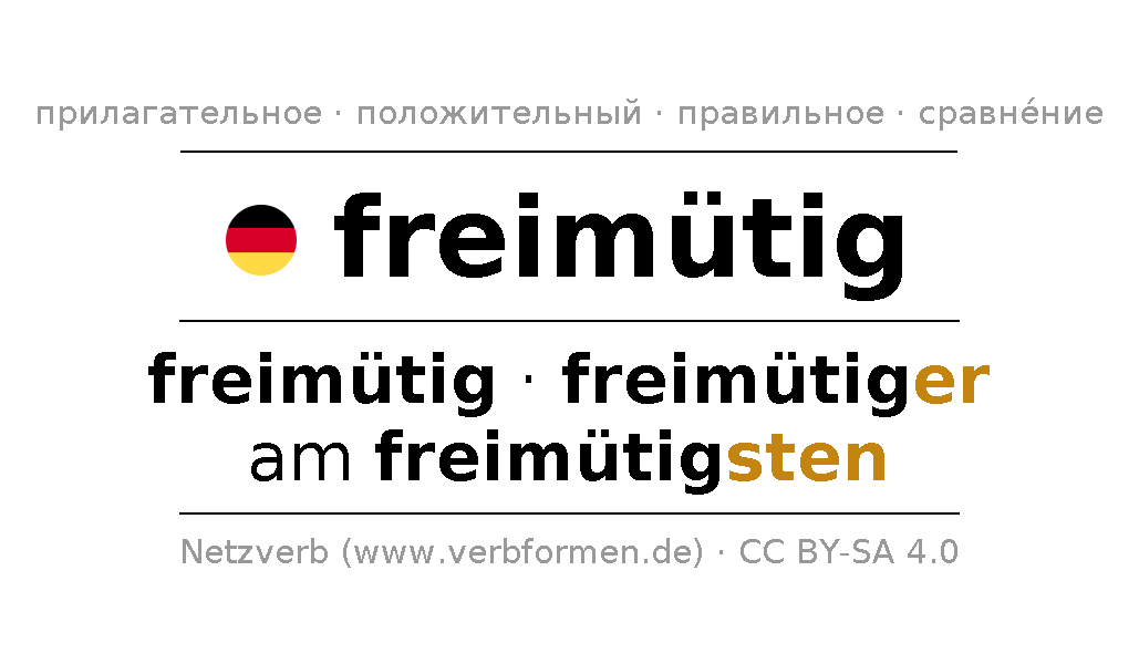 Прилагательное склоняется freimütig (беспощадный, искренний) и в степенях сравнения freimütig,freimütiger,am freimütigsten . Формы сравнительной и превосходной степеней прилагательного имеют следующие суффиксы er/sten. Прилагательное freimütig может употребляться как в качестве определения перед существительным (с артиклем и без него, в формах сильного, слабого и смешанного склонений), так и в качестве именной части сказуемого в сочетании с глаголом.Можно не только отразить и сравнить freimütig, но и все немецкие прилагательные. Kомментарии ☆
