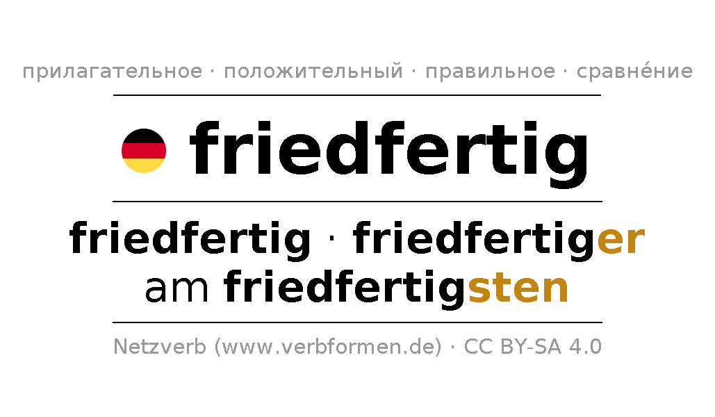 Склонение и степени сравнения friedfertig онлайн в виде таблиц, содержащих все формы сильного, слабого и смешанного склонений. Для наглядности они сведены в одну общую таблицу, в которой представлены формы единственного (Singular) и множественного (Plural) числа всех четырёх падежей: именительного (номинатив или 1-й падеж - кто? что?), родительного (генитив или 2-й падеж - кого? чего? чей?), дательного (датив или 3-й падеж - кому? чему?) и винительного (аккузатив или 4-й падеж - кого? что?). Более подробную информацию Вы найдёте на ... викисловаря ... и на ... в Дудене.