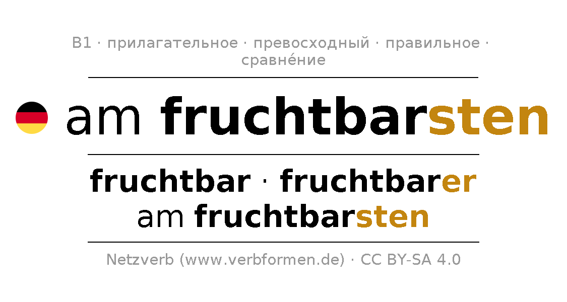 Прилагательное склоняется am fruchtbarsten (плодовитый, плодородный) и в степенях сравнения fruchtbar,fruchtbarer,am fruchtbarsten . Формы сравнительной и превосходной степеней прилагательного имеют следующие суффиксы er/sten. Прилагательное am fruchtbarsten может употребляться как в качестве определения перед существительным (с артиклем и без него, в формах сильного, слабого и смешанного склонений), так и в качестве именной части сказуемого в сочетании с глаголом.Можно не только отразить и сравнить am fruchtbarsten, но и все немецкие прилагательные. Kомментарии ☆