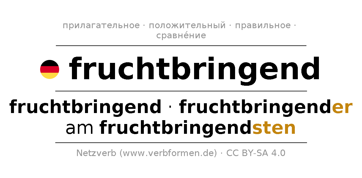 Прилагательное склоняется fruchtbringend (плодотворный, успешный) и в степенях сравнения fruchtbringend,fruchtbringender,am fruchtbringendsten . Формы сравнительной и превосходной степеней прилагательного имеют следующие суффиксы er/sten. Прилагательное fruchtbringend может употребляться как в качестве определения перед существительным (с артиклем и без него, в формах сильного, слабого и смешанного склонений), так и в качестве именной части сказуемого в сочетании с глаголом.Можно не только отразить и сравнить fruchtbringend, но и все немецкие прилагательные. Kомментарии ☆