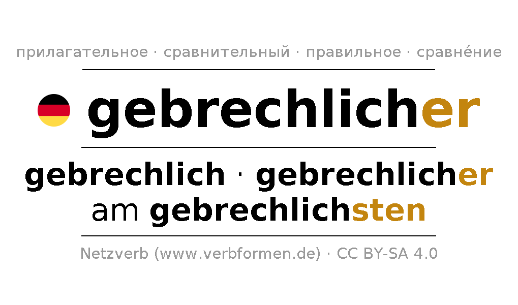 Прилагательное склоняется gebrechlicher (слабый, хрупкий) и в степенях сравнения gebrechlich,gebrechlicher,am gebrechlichsten . Формы сравнительной и превосходной степеней прилагательного имеют следующие суффиксы er/sten. Прилагательное gebrechlicher может употребляться как в качестве определения перед существительным (с артиклем и без него, в формах сильного, слабого и смешанного склонений), так и в качестве именной части сказуемого в сочетании с глаголом.Можно не только отразить и сравнить gebrechlicher, но и все немецкие прилагательные. Kомментарии ☆