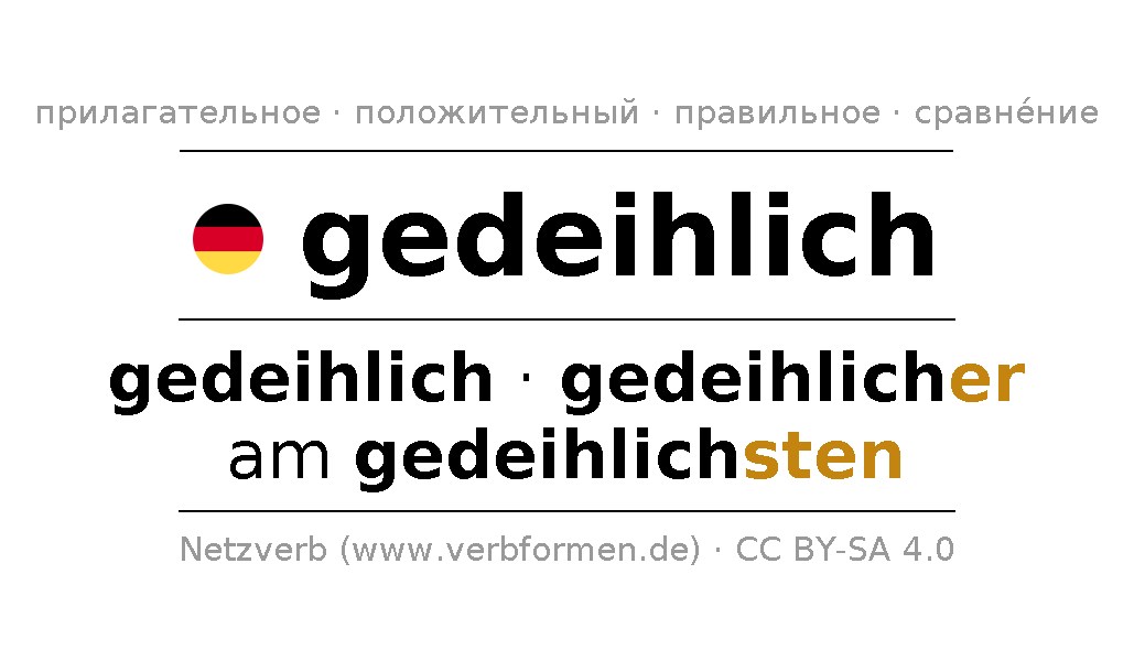 Склонение и степени сравнения gedeihlich онлайн в виде таблиц, содержащих все формы сильного, слабого и смешанного склонений. Для наглядности они сведены в одну общую таблицу, в которой представлены формы единственного (Singular) и множественного (Plural) числа всех четырёх падежей: именительного (номинатив или 1-й падеж - кто? что?), родительного (генитив или 2-й падеж - кого? чего? чей?), дательного (датив или 3-й падеж - кому? чему?) и винительного (аккузатив или 4-й падеж - кого? что?). Более подробную информацию Вы найдёте на ... викисловаря ... и на ... в Дудене.