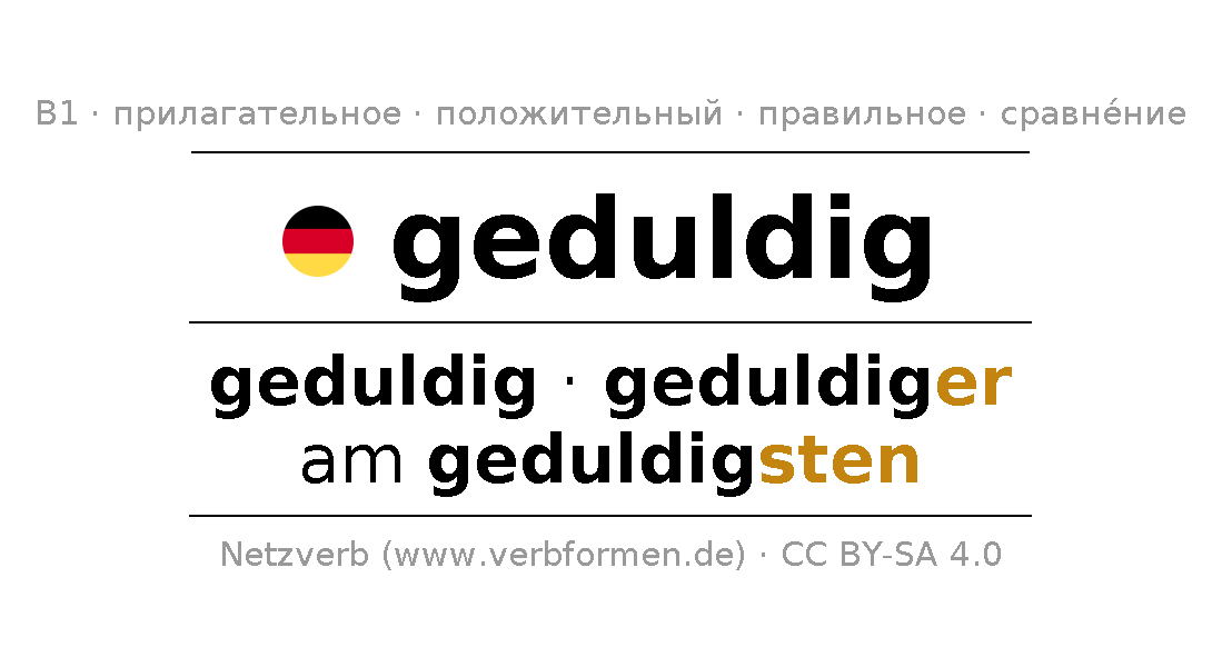 Прилагательное склоняется geduldig (терпеливый) и в степенях сравнения geduldig,geduldiger,am geduldigsten . Формы сравнительной и превосходной степеней прилагательного имеют следующие суффиксы er/sten. Прилагательное geduldig может употребляться как в качестве определения перед существительным (с артиклем и без него, в формах сильного, слабого и смешанного склонений), так и в качестве именной части сказуемого в сочетании с глаголом.Можно не только отразить и сравнить geduldig, но и все немецкие прилагательные. Kомментарии ☆