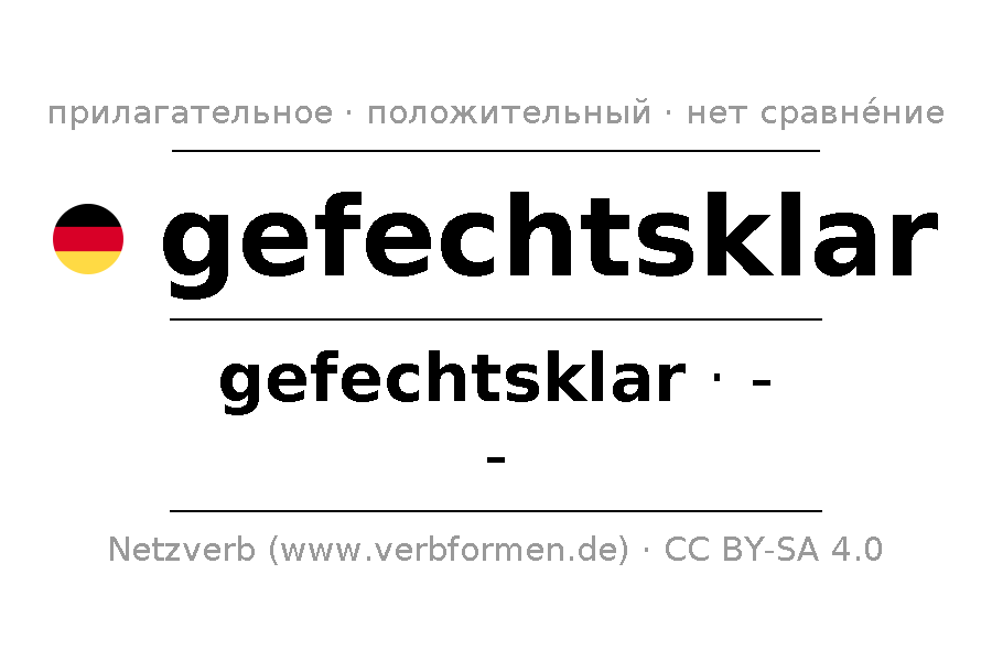 Прилагательное gefechtsklar (готовый к бою) склоняется в положительной степени сравнения gefechtsklar. Прилагательное не имеет сравнительной и превосходной степеней сравнения. Прилагательное gefechtsklar может употребляться как в качестве определения перед существительным (с артиклем и без него, в формах сильного, слабого и смешанного склонений), так и в качестве именной части сказуемого в сочетании с глаголом.Можно не только отразить и сравнить gefechtsklar, но и все немецкие прилагательные. Kомментарии ☆