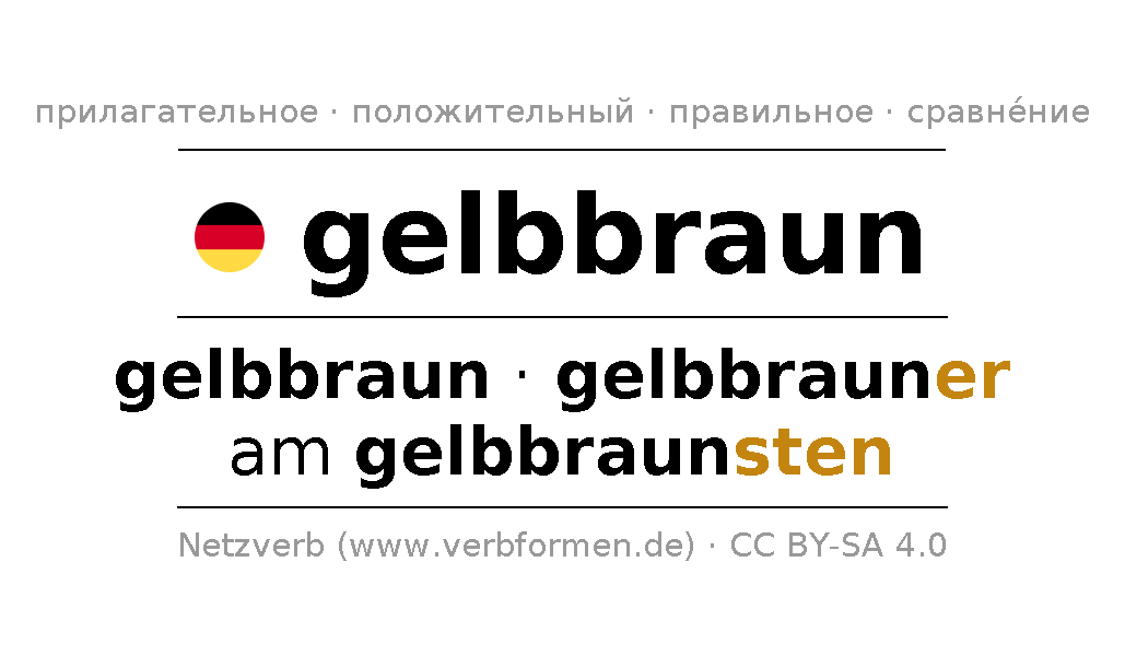 Прилагательное склоняется gelbbraun (желтовато-коричневый) и в степенях сравнения gelbbraun,gelbbrauner,am gelbbraunsten . Формы сравнительной и превосходной степеней прилагательного имеют следующие суффиксы er/sten. Прилагательное gelbbraun может употребляться как в качестве определения перед существительным (с артиклем и без него, в формах сильного, слабого и смешанного склонений), так и в качестве именной части сказуемого в сочетании с глаголом.Можно не только отразить и сравнить gelbbraun, но и все немецкие прилагательные. Kомментарии ☆