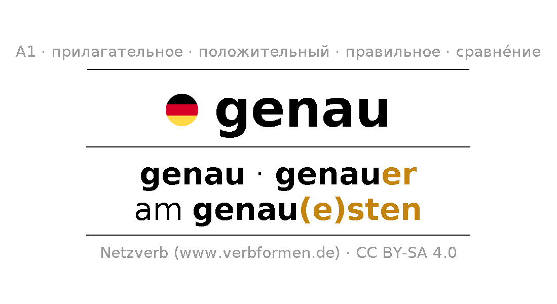 Склонение и степени сравнения genau онлайн в виде таблиц, содержащих все формы сильного, слабого и смешанного склонений. Для наглядности они сведены в одну общую таблицу, в которой представлены формы единственного (Singular) и множественного (Plural) числа всех четырёх падежей: именительного (номинатив или 1-й падеж - кто? что?), родительного (генитив или 2-й падеж - кого? чего? чей?), дательного (датив или 3-й падеж - кому? чему?) и винительного (аккузатив или 4-й падеж - кого? что?). Более подробную информацию Вы найдёте на ... викисловаря ... и на ... в Дудене.