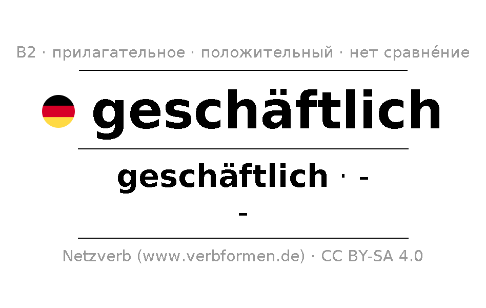 Склонение и степени сравнения geschäftlich онлайн в виде таблиц, содержащих все формы сильного, слабого и смешанного склонений. Для наглядности они сведены в одну общую таблицу, в которой представлены формы единственного (Singular) и множественного (Plural) числа всех четырёх падежей: именительного (номинатив или 1-й падеж - кто? что?), родительного (генитив или 2-й падеж - кого? чего? чей?), дательного (датив или 3-й падеж - кому? чему?) и винительного (аккузатив или 4-й падеж - кого? что?). Более подробную информацию Вы найдёте на ... викисловаря ... и на ... в Дудене.