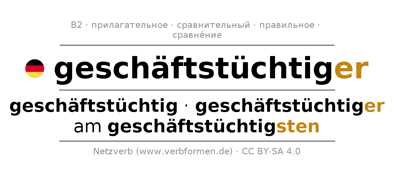 - Множественное число: die geschäftstüchtigeren, der geschäftstüchtigeren, den geschäftstüchtigeren, die geschäftstüchtigeren