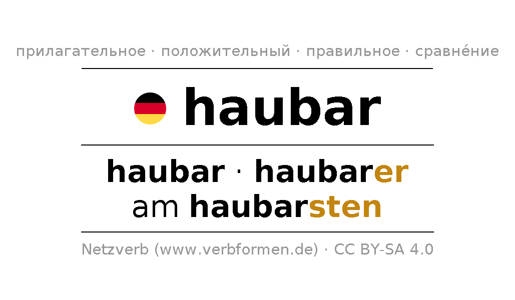 Прилагательное склоняется haubar (тёсаемый) и в степенях сравнения haubar,haubarer,am haubarsten . Формы сравнительной и превосходной степеней прилагательного имеют следующие суффиксы er/sten. Прилагательное haubar может употребляться как в качестве определения перед существительным (с артиклем и без него, в формах сильного, слабого и смешанного склонений), так и в качестве именной части сказуемого в сочетании с глаголом.Можно не только отразить и сравнить haubar, но и все немецкие прилагательные. Kомментарии ☆