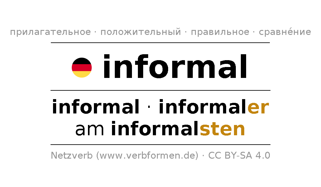 Прилагательное склоняется informal (неформальный) и в степенях сравнения informal,informaler,am informalsten . Формы сравнительной и превосходной степеней прилагательного имеют следующие суффиксы er/sten. Прилагательное informal может употребляться как в качестве определения перед существительным (с артиклем и без него, в формах сильного, слабого и смешанного склонений), так и в качестве именной части сказуемого в сочетании с глаголом.Можно не только отразить и сравнить informal, но и все немецкие прилагательные. Kомментарии ☆