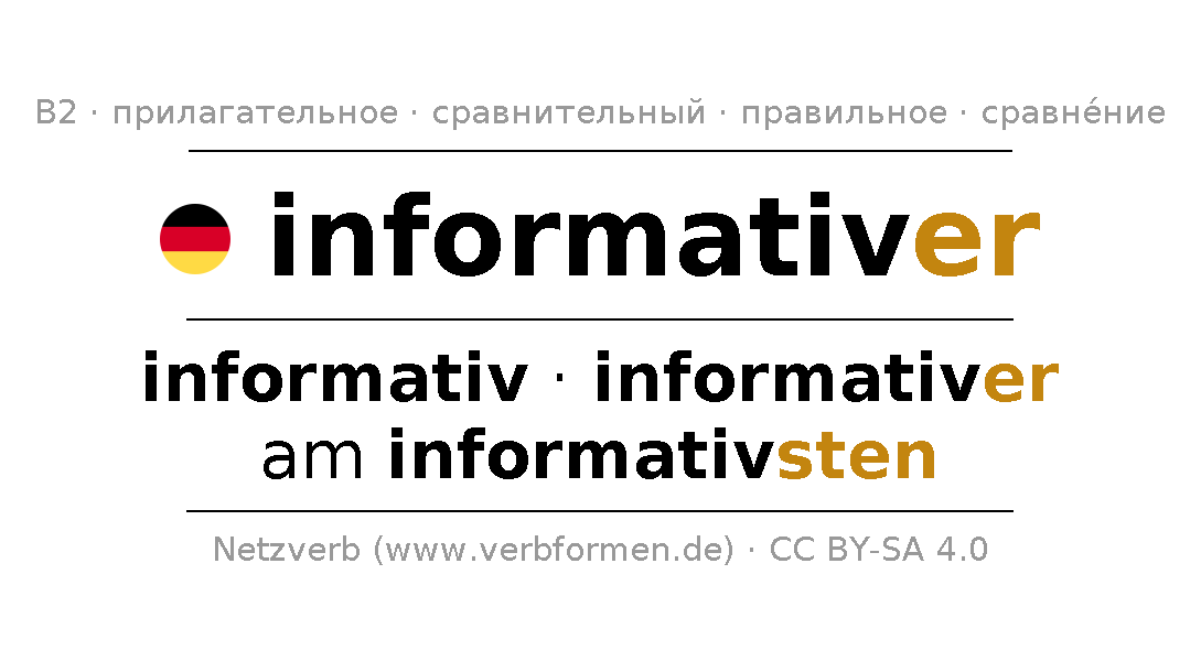 Прилагательное склоняется informativer (информативный) и в степенях сравнения informativ,informativer,am informativsten . Формы сравнительной и превосходной степеней прилагательного имеют следующие суффиксы er/sten. Прилагательное informativer может употребляться как в качестве определения перед существительным (с артиклем и без него, в формах сильного, слабого и смешанного склонений), так и в качестве именной части сказуемого в сочетании с глаголом.Можно не только отразить и сравнить informativer, но и все немецкие прилагательные. Kомментарии ☆